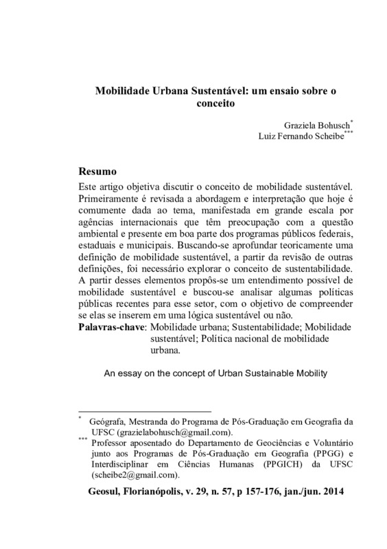 http://dx.doi.org/10.5007/2177-5230.2014v29n57p157Este artigo objetiva discutir o conceito de mobilidade sustentável. Primeiramente é revisada a abordagem e interpretação que hoje é comumente dada ao tema, manifestada em grande escala por agências internacionais que têm preocupação com a questão ambiental e presente em boa parte dos programas públicos federais, estaduais e municipais.Buscando-se aprofundar teoricamente uma definição de mobilidade sustentável, a partir da revisão de outras definições, foi necessário explorar o conceito de sustentabilidade. A partir desses elementos propôs-se um entendimento possível de mobilidade sustentável e buscou-se analisar algumas políticas públicas recentes para esse setor, com o objetivo de compreender se elas se inserem em uma lógica sustentável ou não.