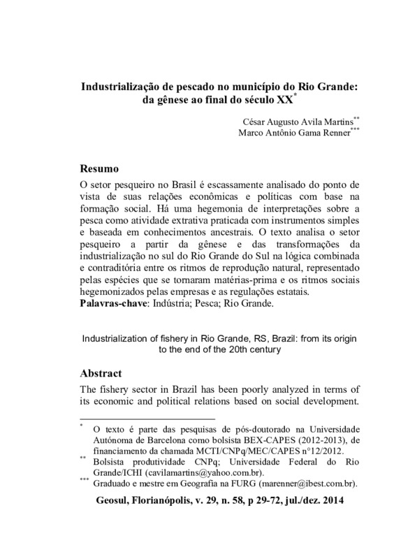 O setor pesqueiro no Brasil é escassamente analisado do ponto de vista de suas relações econômicas e políticas com base na formação social. Há uma hegemonia de interpretações sobre a pesca como atividade extrativa praticada com instrumentos simples e baseada em conhecimentos ancestrais. O texto analisa o setor pesqueiro a partir da gênese e das transformações da industrialização no sul do Rio Grande do Sul na lógica combinada e contraditória entre os ritmos de reprodução natural, representado pelas espécies que se tornaram matérias-prima e os ritmos sociais hegemonizados pelas empresas e as regulações estatais.