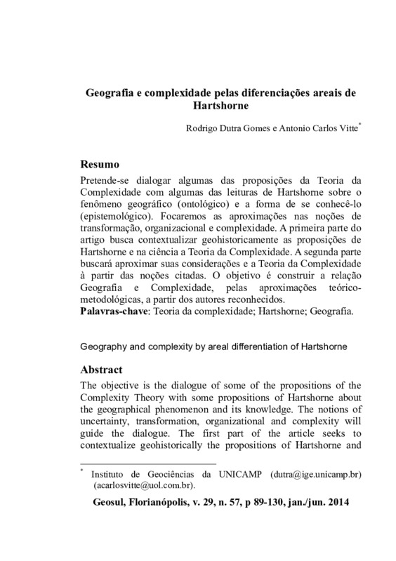 http://dx.doi.org/10.5007/2177-5230.2014v29n57p89Pretende-se dialogar algumas das proposições da Teoria da Complexidade com algumas das leituras de Hartshorne sobre o fenômeno geográfico (ontológico) e a forma de se conhecê-lo (epistemológico). Focaremos as aproximações nas noções de transformação, organizacional e complexidade. A primeira parte do artigo busca contextualizar geohistoricamente as proposições de Hartshorne e na ciência a Teoria da Complexidade. A segunda parte buscará aproximar suas considerações e a Teoria da Complexidade à partir das noções citadas. O objetivo é construir a relação Geografia e Complexidade, pelas aproximações teórico-metodológicas, a partir dos autores reconhecidos.