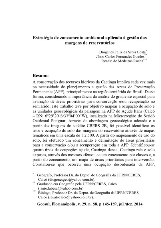 A conservação dos recursos hídricos da Caatinga implica cada vez mais na necessidade de planejamento e gestão das Áreas de Preservação Permanente (APP), principalmente na região semiárida do Brasil. Dessa forma, considerando a importância da análise do gradiente espacial para avaliação de áreas prioritárias para conservação e/ou recuperação no semiárido, este trabalho teve por objetivo mapear a ocupação do solo e as unidades geoecológicas da paisagem na APP do Açude Itans (Caicó – RN: 6°29’20”S/37°04’00”W), localizado na Microrregião do Seridó Ocidental Potiguar. Através da abordagem geoecológica adotada e a partir das imagens do satélite CBERS 2B, foi possível identificar os usos e ocupação do solo das margens do reservatório através de mapas temáticos em uma escala de 1:2.500. A partir do mapeamento de uso do solo, foi efetuado um zoneamento e delimitação de áreas prioritárias para a conservação e/ou a recuperação em toda a APP. Identificou-se quatro tipos de ocupação: açude, Caatinga densa, Caatinga rala e solo exposto, através dos mesmos efetuou-se um zoneamento por classes e, a partir do zoneamento, um mapa de áreas prioritárias para intervensão. Constatou-se que ocorreu uma ocupação desordenada da APP, indicando-se áreas prioritárias para recuperação e/ou uso restrito, com estratégias diferenciadas para a gestão desse espaço. Nestas áreas prioritárias focou-se a necessidade da tomada imediata de ações voltadas à recuperação ambiental das áreas degradadas e sensibilização ambiental da população ribeirinha. Exatamente no tocante as ações antrópicas de uso desse espaço, indicou-se como elevada prioridade a realização de campanhas de sensibilização ambiental junto às margens.