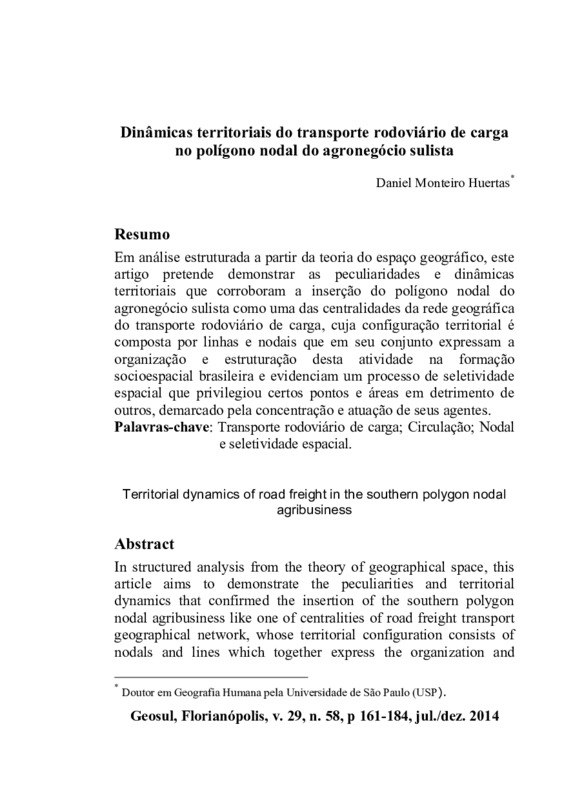 Em análise estruturada a partir da teoria do espaço geográfico, este artigo pretende demonstrar as peculiaridades e dinâmicas territorias que corroboram a inserção do polígono nodal do agronegócio sulista como uma das centralidades da rede geográfica do transporte rodoviário de carga, cuja configuração territorial é composta por linhas e nodais que em seu conjunto expressam a organização e estruturação desta atividade na formação socioespacial brasileira e evidenciam um processo de seletividade espacial que privilegiou certos pontos e áreas em detrimento de outros, demarcado pela concentração e atuação de seus agentes.