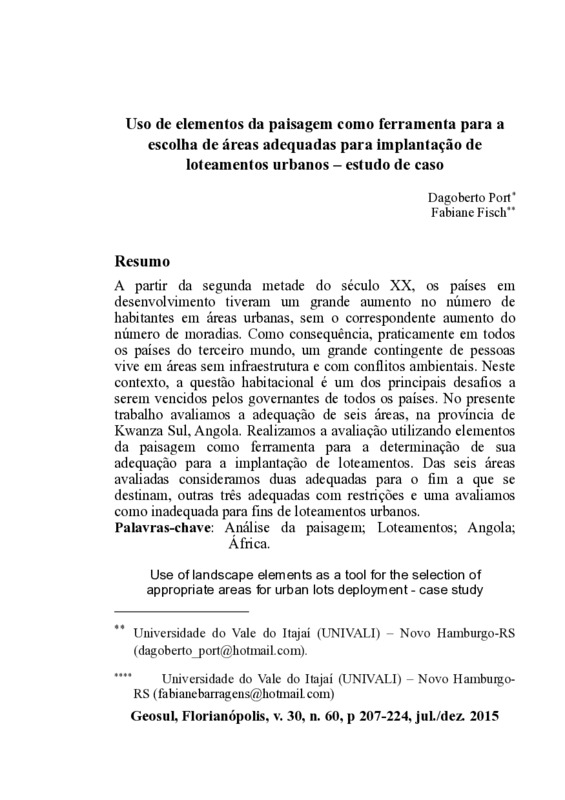A partir da segunda metade do século XX, os países em desenvolvimento tiveram um grande aumento no número de habitantes em áreas urbanas, sem o correspondente aumento do número de moradias. Como consequência, praticamente em todos os países do terceiro mundo, um grande contingente de pessoas vive em áreas sem infraestrutura e com conflitos ambientais. Neste contexto, a questão habitacional é um dos principais desafios a serem vencidos pelos governantes de todos os países. No presente trabalho avaliamos a adequação de seis áreas, na província de Kwanza Sul, Angola. Realizamos a avaliação utilizando elementos da paisagem como ferramenta para a determinação de sua adequação para a implantação de loteamentos. Das seis áreas avaliadas consideramos duas adequadas para o fim a que se destinam, outras três adequadas com restrições e uma avaliamos como inadequada para fins de loteamentos urbanos.