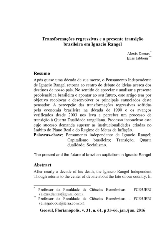 http://dx.doi.org/10.5007/2177-5230.2016v31n61p33Após quase uma década de sua morte, o Pensamento Independente de Ignacio Rangel retorna ao centro do debate de ideias acerca dos destinos de nosso país. No sentido de apreciar e analisar a presente problemática brasileira e apontar ao seu futuro, este artigo tem por objetivo recolocar e desenvolver os principais enunciados deste pensador. A percepção das transformações regressivas sofridas pela economia brasileira na década de 1990 e os avanços verificados desde 2003 nos leva a perceber um processo de transição à Quarta Dualidade rangeliana. Processo inconcluso este cujo sucesso demanda superar as institucionalidades criadas no âmbito do Plano Real e do Regime de Metas de Inflação.