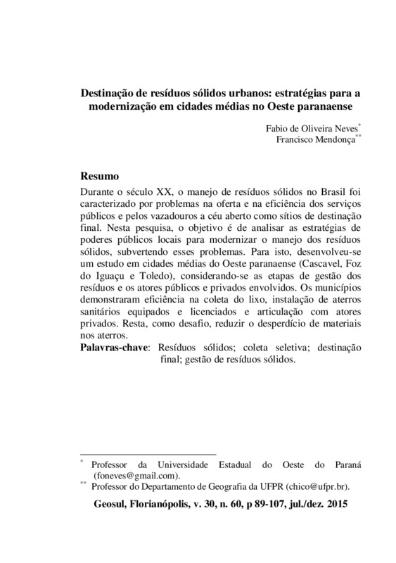 Durante o século XX, o manejo de resíduos sólidos no Brasil foi caracterizado por problemas na oferta e eficiência dos serviços públicos e pelos vazadouros a céu aberto como sítio de destinação final. Nesta pesquisa, o objetivo é de analisar as estratégias de poderes públicos locais para modernizar o manejo dos resíduos sólidos, subvertendo esses problemas. Para isto, desenvolveu-se um estudo em cidades médias do Oeste Paranaense (Cascavel, Foz do Iguaçu e Toledo), considerando-se as etapas de gestão dos resíduos e os atores públicos e privados envolvidos. Os municípios demonstraram eficiência na coleta do lixo, a instalação de aterros sanitários equipados e licenciados e a articulação com atores privados. Resta, contudo, como desafio o desperdício de materiais nos aterros.