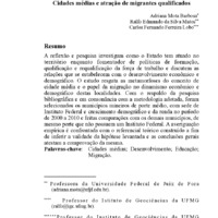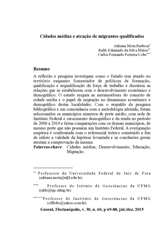 A reflexão e pesquisa investigam como o Estado tem atuado no território enquanto fomentador de políticas de formação, qualificação e requalificação da força de trabalho e discutem as relações que se estabelecem com o desenvolvimento econômico e demográfico. O estudo resgata as metamorfoses do conceito de cidade média e o papel da migração no dinamismo econômico e demográfico destas localidades. Com o respaldo da pesquisa bibliográfica e em consonância com a metodologia adotada, foram selecionados os municípios mineiros de porte médio, com sede de Instituto Federal e crescimento demográfico e da renda no período de 2000 a 2010 e feitas comparações com os demais municípios, de mesmo porte que não possuem um Instituto Federal. A averiguação empírica é confrontada com o referencial teórico construído a fim de inferir a validade da hipótese levantada e as conclusões gerais atestam a comprovação da mesma.