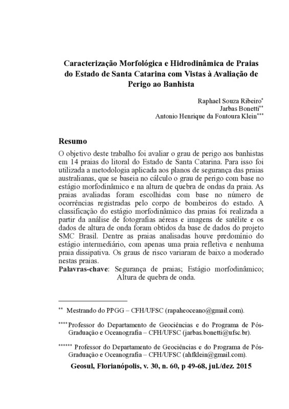 O objetivo deste trabalho foi avaliar o grau de perigo aos banhistas de 14 praias do litoral de Santa Catarina. Para isso foi utilizada a metodologia aplicada nos planos de segurança nas praias australianos. O método consiste em calcular o grau de perigo com base no estágio morfodinâmico e na altura de quebra da praia. As praias a serem avaliadas foram escolhidas com base no número de ocorrências apontado no registro do corpo de bombeiros do estado. A classificação do estágio morfodinâmico das praias foi realizada com fotografia aérea e imagens de satélite. Os dados de altura de onda foram obtidos da base de dados do projeto SMC Brasil. Dentre as praias analisadas houve o predomínio do estágio intermediário com apenas uma praia refletiva e nenhuma praia dissipativa. Os graus de risco variaram de baixo a moderado nas praias verificadas.