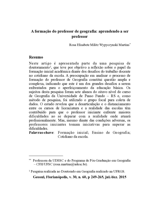 Resumo: Neste artigo é apresentada parte da uma pesquisa de doutoramento[1], que teve por objetivo a reflexão sobre o papel da formação inicial acadêmica diante dos desafios do trabalho docente no cotidiano da escola. A preocupação em analisar o processo de formação do professor de Geografia constitui questão ampla e complexa, indicando que este é um dos grandes desafios a serem enfrentados para o aperfeiçoamento da educação básica. Os sujeitos desta pesquisa foram sete alunos do oitavo nível do curso de Geografia da Universidade de Passo Fundo – RS e, como método de pesquisa, foi utilizado o grupo focal para coleta de dados. O estudo revelou que a desarticulação e o distanciamento entre os cursos de licenciatura e a realidade das escolas têm contribuído para que o professor iniciante enfrente maiores dificuldades ao se deparar com a realidade onde atuará profissionalmente. Mas, mesmo diante das condições adversas, os professores iniciantes tomam iniciativas para superar as dificuldades.[1] Pesquisa realizada no Doutorado em Geografia realizado na UFRGS.