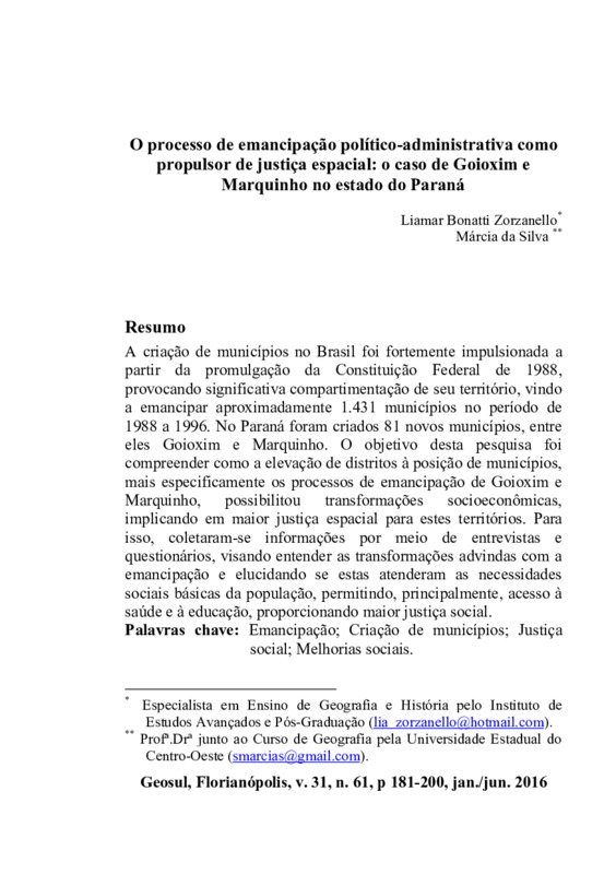 http://dx.doi.org/10.5007/2177-5230.2016v31n61p181A criação de municípios no Brasil foi fortemente impulsionada a partir da promulgação da Constituição Federal de 1988, provocando significativa compartimentação de seu território, vindo a emancipar aproximadamente 1.431 municípios no período de 1988 a 1996. No Paraná foram criados 81 novos municípios, entre eles Goioxim e Marquinho. O objetivo desta pesquisa foi compreender como a elevação de distritos à posição de municípios, mais especificamente os processos de emancipação de Goioxim e Marquinho, possibilitou transformações socioeconômicas, implicando em maior justiça espacial para estes territórios. Para isso, coletaram-se informações por meio de entrevistas e questionários, visando entender as transformações advindas com a emancipação e elucidando se estas atenderam as necessidades sociais básicas da população, permitindo, principalmente, acesso à saúde e à educação, proporcionando maior justiça social.