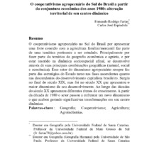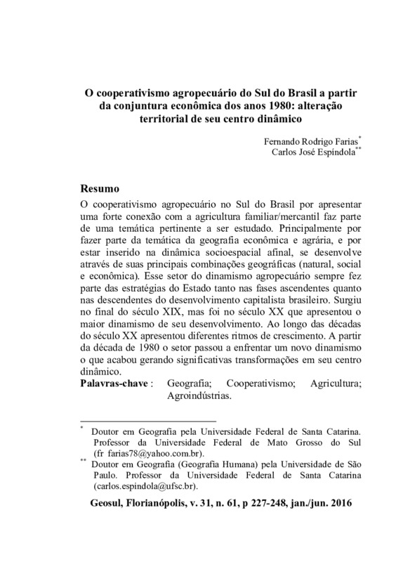 http://dx.doi.org/10.5007/2177-5230.2016v31n61p227O cooperativismo agropecuário no Sul do Brasil por apresentar uma forte conexão com a agricultura familiar/mercantil faz parte de uma temática pertinente a ser estudado. Principalmente por fazer parte da temática da geografia econômica e agrária, e por estar inserido na dinâmica socioespacial afinal, se desenvolve através de suas principais combinações geográficas (natural, social e econômica). Esse setor do dinamismo agropecuário sempre fez parte das estratégias do Estado tanto nas fases ascendentes quanto nas descendentes do desenvolvimento capitalista brasileiro. Surgiu no final do século XIX, mas foi no século XX que apresentou o maior dinamismo de seu desenvolvimento. Ao longo das décadas do século XX apresentou diferentes ritmos de crescimento. A partir da década de 1980 o setor passou a enfrentar um novo dinamismo o que acabou gerando significativas transformações em seu centro dinâmico.