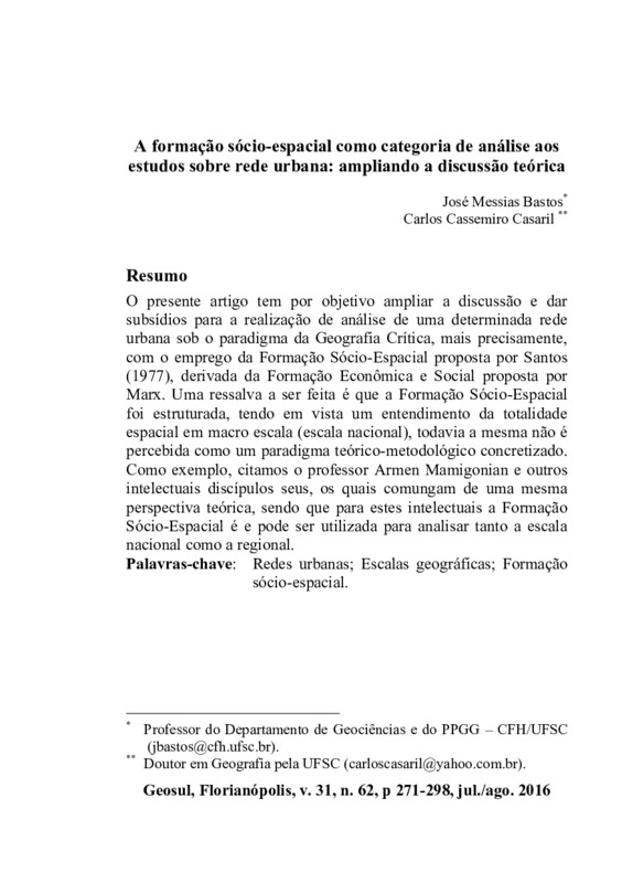 http://dx.doi.org/10.5007/2177-5230.2016v31n62p271O presente artigo tem por objetivo ampliar a discussão e dar subsídios para a realização de análise de uma determinada rede urbana sob o paradigma da Geografia Crítica, mais precisamente, com o emprego da Formação Sócio-Espacial proposta por Santos (1977), derivada da Formação Econômica e Social proposta por Marx. Uma ressalva a ser feita é que a Formação Sócio-Espacial foi estruturada, tendo em vista um entendimento da totalidade espacial em macro escala (escala nacional), todavia a mesma não é percebida como um paradigma teórico-metodológico concretizado. Como exemplo, citamos o professor Armen Mamigonian e outros intelectuais discípulos seus, os quais comungam de uma mesma perspectiva teórica, sendo que para estes intelectuais a Formação Sócio-Espacial é e pode ser utilizada para analisar tanto a escala nacional como a regional.