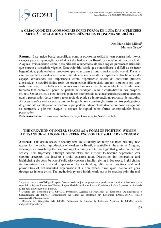 A criação de espaços sociais como forma de luta das mulheres artesãs de Alagoas: a experiência da economia solidária