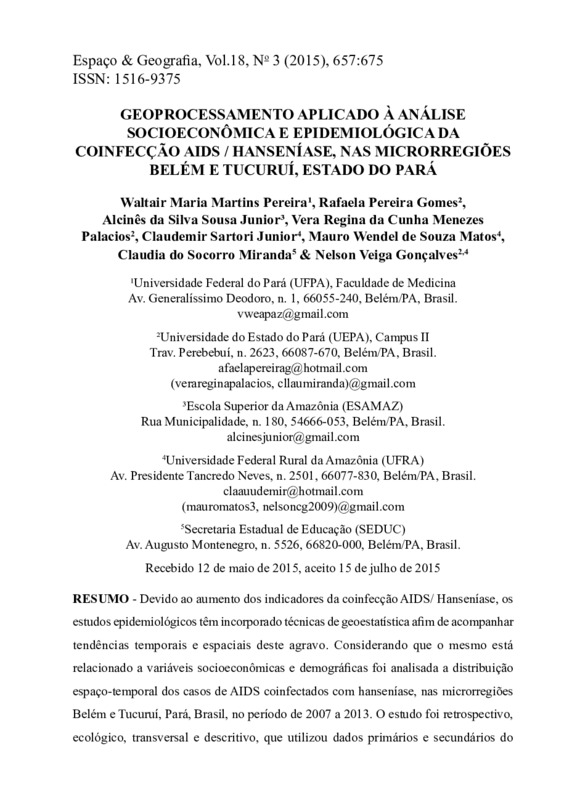 GEOPROCESSAMENTO APLICADO À ANÁLISE SOCIOECONÔMICA E EPIDEMIOLÓGICA DA COINFECÇÃO AIDS / HANSENÍASE, NAS MICRORREGIÕES BELÉM E TUCURUÍ, ESTADO DO PARÁ
