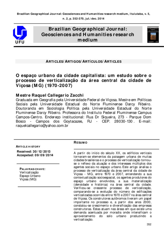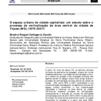 A partir do início do século XX, os edifícios verticais tornaram-se elementos da paisagem urbana de muitas cidades brasileiras e o processo de verticalização tornou-se o reflexo da atuação e dos interesses múltiplos dos agentes sociais no espaço urbano. Este artigo analisa o processo de verticalização da área central da cidade de Viçosa - MG, entre 1970 e 2007, entendendo a sua contextualização socioespacial, os agentes produtores do espaço urbano envolvidos, a sua materialização (densidade e histórica) na área central da cidade. Verificou-se crescente processo de verticalização, comparando-se a evolução do número de edificações verticalizadas ocorrida entre 1970 e 2007 na área central de Viçosa. Os construtores autônomos tiveram um papel importante no processo e, a partir dos anos 2000, constatou-se crescimento e diversificação das empresas construtoras. Estas atuam nas áreas em que existe uma demanda acentuada por moradia onde intensificam o aproveitamento do solo urbano produzindo a verticalização.