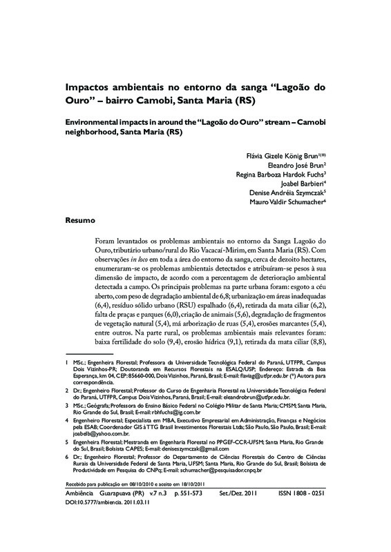 Foram levantados os problemas ambientais no entorno da Sanga Lagoão do Ouro, tributário urbano/rural do Rio Vacacaí-Mirim, em Santa Maria (RS). Com observações in loco em toda a área do entorno da sanga, cerca de dezoito hectares, enumeraram-se os problemas ambientais detectados e atribuíram-se pesos à sua dimensão de impacto, de acordo com a percentagem de deterioração ambiental detectada a campo. Os principais problemas na parte urbana foram: esgoto a céu aberto, com peso de degradação ambiental de 6,8; urbanização em áreas inadequadas (6,4), resíduo sólido urbano (RSU) espalhado (6,4), retirada da mata ciliar (6,2), falta de praças e parques (6,0), criação de animais (5,6), degradação de fragmentos de vegetação natural (5,4), má arborização de ruas (5,4), erosões marcantes (5,4), entre outros. Na parte rural, os problemas ambientais mais relevantes foram: baixa fertilidade do solo (9,4), erosão hídrica (9,1), retirada da mata ciliar (8,8), queimadas (8,2), degradação de fragmentos florestais (7,9), RSU espalhado (7,6), esgoto a céu aberto (7,0), aplicação de agrotóxicos (6,7), depósito de embalagens de agrotóxicos (6,7), entre outros. Neste âmbito, é urgente a realização de trabalhos de educação ambiental entre os moradores do entorno da sanga e a realização de projetos técnicos para a resolução dos problemas ambientais existentes.Abstract Environmental problem occurred in the proximity of “Lagoão do Ouro” Stream was evaluated, which is an urban/rural tributary from Vacacaí-Mirim river, in Santa Maria (RS). Considering the observation of the whole area in around the stream, about 18ha, it was enumerated the detected environmental problems and weights were attributed to its impact dimension, according to the environmental deterioration percentage detected in the study area. The main problems in the urban part of the area were: drain open sky, with weight of environmental degradation of 6.8; urbanization in inadequate areas (6.4), dispersed garbage (6.4), cut of the riparian forest (6.2), lack of squares and parks (6.0), animals raising (5.6), degradation of fragments of natural vegetation (5.4), bad tree-lined streets (5.4), severe erosion (5.4), among others. In the rural part of the in around of the stream, the most relevant environmental problems presented were: low soil fertility (9.4), hydro erosion (9.1), cut of the riparian forest (8.8), forest fire (8.2), degradation of forest fragments (7.9), dispersed garbage (7.6), drain open sky (7.0), agrotoxic application (6.7), deposit of agrotoxic packaging (6.7), among others. In this context, it is urgent the development of environmental educational programs to those people who live in around of the stream and the accomplishment of technical projects in order to solve the existent environmental problems.