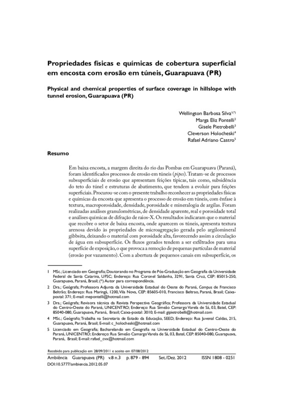 Em baixa encosta, a margem direita do rio das Pombas em Guarapuava (Paraná), foram identificados processos de erosão em túneis (pipes). Tratam-se de processos subsuperficiais de erosão que apresentam feições típicas, tais como, subsidência do teto do túnel e estruturas de abatimento, que tendem a evoluir para feições superficiais. Procurou-se com o presente trabalho reconhecer as propriedades físicas e químicas da encosta que apresenta o processo de erosão em túneis, com ênfase à textura, macroporosidade, densidade, porosidade e mineralogia de argilas. Foram realizadas análises granulométricas, de densidade aparente, real e porosidade total e análises químicas de difração de raios-X. Os resultados indicaram que o material que recobre o setor de baixa encosta, onde aparecem os túneis, apresenta textura arenosa devido às propriedades de microagregação gerada pelo argilomineral gibbsita, deixando o material com porosidade alta, favorecendo assim a circulação de água em subsuperfície. Os fluxos gerados tendem a ser exfiltrados para uma superfície de exposição, o que provoca a remoção de pequenas partículas de material (erosão por vazamento). Com a abertura de pequenos canais em subsuperfície, os fluxos tendem a se concentrar (escoamento por túnel) e consequentemente ampliar os canais subsuperficiais pela ação mecânica da água. As características físicas e químicas encontradas na baixa encosta demonstram que a cobertura superficial é determinante para a instalação da erosão subsuperficial em túneis na área.Abstract In lower hillslope, on the right bank of rio das Pombas, Paraná state, processes of tunnel erosion (pipes) were identified. These are subsuperficial erosion processes with typical features, such as subsidence of the tunnel roof and rebate structures, which tend to evolve to superficial features. With emphasis on texture, macroporosity, bulk density, porosity and clay mineralogy, this work aimed at recognizing the physical and chemical properties of the slope that shows the erosion process in tunnels. Analysis of size, apparent density, real and total porosity, as well as chemical analyzes of X-ray diffraction were performed. The results indicated that the material that covers the lower slope sector, where tunnels appear, is of a sandy texture because of the micro-aggregation properties generated by the clay mineral gibbsite, leaving the material with high porosity, thereby facilitating the movement of subsurface water. The generated flows tend to be exfiltrated to a ditch wall-like surface that causes the removal of small particles of matter (seepage).With the opening of small channels in the subsurface, flows tend to concentrate (tunnel scour) and, thus, expand the channels by the mechanical action of subsurface water. The physical and chemical characteristics that were found in the lower slope show that the surface coverage is crucial for the installation of subsurface erosion in tunnels in the area.