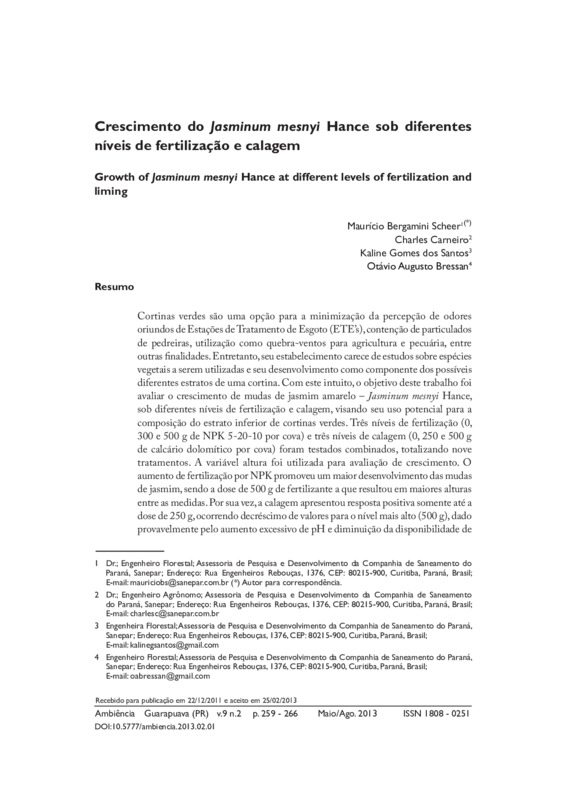 Cortinas verdes são uma opção para a minimização da percepção de odores oriundos de Estações de Tratamento de Esgoto (ETE’s), contenção de particulados de pedreiras, utilização como quebra-ventos para agricultura e pecuária, entre outras finalidades. Entretanto, seu estabelecimento carece de estudos sobre espécies vegetais a serem utilizadas e seu desenvolvimento como componente dos possíveis diferentes estratos de uma cortina. Com este intuito, o objetivo deste trabalho foi avaliar o crescimento de mudas de jasmim amarelo – Jasminum mesnyi Hance, sob diferentes níveis de fertilização e calagem, visando seu uso potencial para a composição do estrato inferior de cortinas verdes. Três níveis de fertilização (0, 300 e 500 g de NPK 5-20-10 por cova) e três níveis de calagem (0, 250 e 500 g de calcário dolomítico por cova) foram testados combinados, totalizando nove tratamentos. A variável altura foi utilizada para avaliação de crescimento. O aumento de fertilização por NPK promoveu um maior desenvolvimento das mudas de jasmim, sendo a dose de 500 g de fertilizante a que resultou em maiores alturas entre as medidas. Por sua vez, a calagem apresentou resposta positiva somente até a dose de 250 g, ocorrendo decréscimo de valores para o nível mais alto (500 g), dado provavelmente pelo aumento excessivo de pH e diminuição da disponibilidade de alguns micronutrientes no solo. Assim, para o crescimento das mudas de jasmim nestas condições, recomenda-se o uso da dose mais alta de fertilizante e da dose intermediária de calcário.Abstract Shelterbelts are an option to minimize the perception of odours from Sewage Treatment Plants, to contain particulates from quarries, used as windbreaks for farming and agriculture, among other purposes. However, their establishment need studies on plants species to be used and their potential development in different strata of a shelterbelt. Therefore, the aim of this study was to evaluate the growth of seedlings of yellow jasmine - Jasminum mesnyi Hance, under different levels of fertilization and liming, seeking its potential use for the composition of the lower stratum of shelterbelts. Three fertilization levels (0, 300 and 500 g of NPK 5-20-10 per hole) and three levels of lime (0, 250 and 500 g of lime per plant) were tested in combination, summing up nine treatments. The heights were used to evaluate growth. The increase of NPK fertilization promoted higher development of seedlings, and the dose of 500 g of fertilizer resulted in greater heights. Liming had a positive response only to the dose of 250 g, occurring decrease of values for the highest level (500 g), probably due to the excessive increase of pH and decreased availability of micronutrients in the soil. Thus, for the growth of seedlings of jasmine in these conditions, we recommend the use of the higher tested dose of fertilizer and the intermediate level of lime.