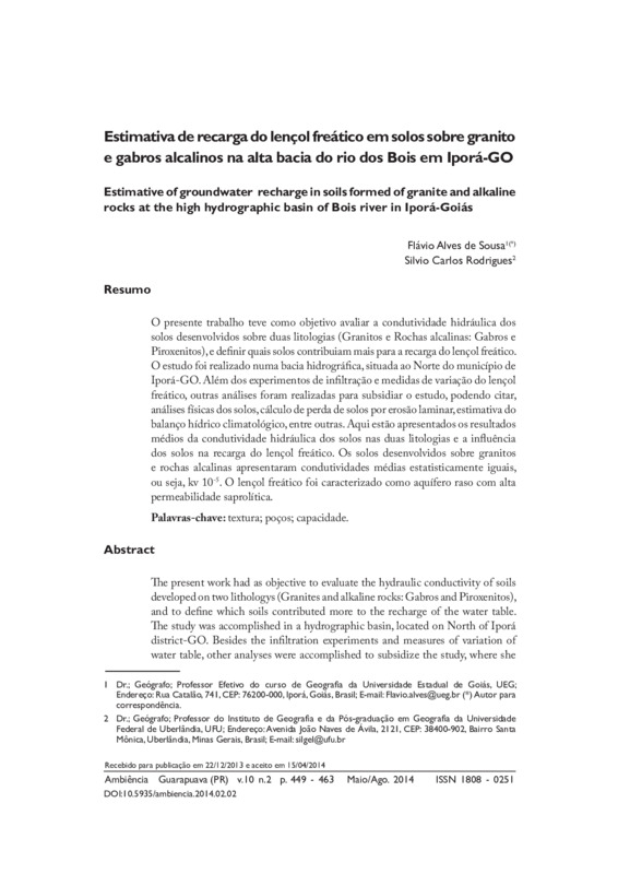O presente trabalho teve como objetivo avaliar a condutividade hidráulica dos solos desenvolvidos sobre duas litologias (Granitos e Rochas alcalinas: Gabros e Piroxenitos), e definir quais solos contribuiam mais para a recarga do lençol freático. O estudo foi realizado numa bacia hidrográfica, situada ao Norte do município de Iporá-GO. Além dos experimentos de infiltração e medidas de variação do lençol freático, outras análises foram realizadas para subsidiar o estudo, podendo citar, análises físicas dos solos, cálculo de perda de solos por erosão laminar, estimativa do balanço hídrico climatológico, entre outras. Aqui estão apresentados os resultados médios da condutividade hidráulica dos solos nas duas litologias e a influência dos solos na recarga do lençol freático. Os solos desenvolvidos sobre granitos e rochas alcalinas apresentaram condutividades médias estatisticamente iguais, ou seja, kv 10-5. O lençol freático foi caracterizado como aquífero raso com alta permeabilidade saprolítica.Abstract The present work had as objective to evaluate the hydraulic conductivity of soils developed on two lithologys (Granites and alkaline rocks: Gabros and Piroxenitos), and to define which soils contributed more to the recharge of the water table. The study was accomplished in a hydrographic basin, located on North of Iporá district-GO. Besides the infiltration experiments and measures of variation of water table, other analyses were accomplished to subsidize the study, where she can mention, physical analyses of the soils, calculation loss of soils for laminate erosion, estimate of the swinging hydric climatological, among others. Here they are presented in a brief way the medium results of the hydraulic conductivity of the soils in the two lithology ́s, and the influence of soils on the recharge of water table. The soils developed on granites and alkaline rocks presented conductivities medium same statisticaly, in other words, k 10-5. The water table was characterized as shallow aquifers with high saprolitic permeability.