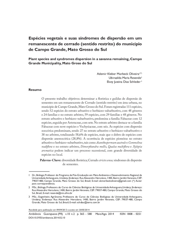 O presente trabalho objetivou determinar a florística e guildas de dispersão de sementes em um remanescente de Cerrado (sentido restrito) em área urbana, no município de Campo Grande, Mato Grosso do Sul. Foram registradas 111 espécies, sendo 52 espécies do estrato arbustivo e herbáceo-subarbustivo, com 48 gêneros e 24 famílias e no estrato arbóreo, 59 espécies, com 29 famílias e 48 gêneros. No estrato arbustivo e herbáceo-subarbustivo predomina a família Fabaceae com 12 espécies, seguida por Asteraceae, com sete. No estrato arbóreo também destaca-se a família Fabaceae com nove espécies e Vochysiaceae, com seis. As espécies com dispersão zoocórica predominam, sendo 27 no estrato arbustivo e herbáceo-subarbustivo e 38 no arbóreo, totalizando 58,6% de espécies, mais que o dobro de espécies com dispersão anemocórica (28,8%). A ocorrência de espécies pioneiras no estrato arbustivo e herbáceo-subarbustivo, tais como Acanthospermum australe e Commelina nudiflora e no estrato arbóreo, Dimorphandra mollis, Qualea multiflora e Xylopia aromatica podem indicar um processo sucessional, com grande diversidade de espécies no local.Abstract The present study aimed to determine the floristic and dispersion guilds in a Cerrado remnant in urban area, Campo Grande, Mato Grosso do Sul. Were registered 111 species, with 52 species of shrubs, sub shrubs and herbaceous, with 48 genus and 24 families and trees, 59 species with 29 families and 48 genus. In shrubs, sub shrubs and herbaceous stratum strands predominates the family Fabaceae with 12 species and Asteraceae, seven. In arboreal stratum stands also predominates the family Fabaceae with nine species and Vochysiaceae, six. Predominate species with seed dispersal by animals (shrubs, sub shrubs and herbaceous = 27, arboreal = 38), totaling 58.6% of species, more than twice the species anemochoric (28.8%). The occurrence of pioneer in shrubs, sub shrubs and herbaceous, as Acanthospermum australe and Commelina nudiflora and arboreal, Dimorphandra mollis, Qualea multiflora and Xylopia aromatica may indicate a succession process, with great diversity found at the site.