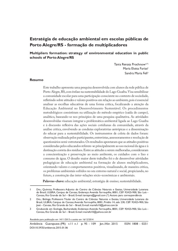 Este trabalho apresenta uma pesquisa desenvolvida com alunos da rede pública de Porto Alegre, RS, com ênfase na sustentabilidade do Lago Guaíba. Visa sensibilizar a comunidade escolar para uma participação consciente no contexto de sociedade, refletindo sobre atitudes e valores positivos em relação ao ambiente, pois é essencial analisar as escolhas educativas de uma forma crítica, focalizando a atenção da Educação Ambiental no Desenvolvimento Sustentável. Os procedimentos metodológicos consistiram na utilização do método empírico (saída de campo), analítico, baseando-se nos princípios de uma pesquisa qualitativa. As atividades desenvolvidas visaram integrar a problemática ambiental ligada ao Lago Guaíba e à discussão reflexiva das ações sociais cotidianas da comunidade, através da análise crítica, envolvendo as condutas exploratórias antrópicas e a disseminação do educar para a sustentabilidade. Os instrumentos de coleta de dados foram: observação realizada pelos participantes, entrevistas, assessoramentos e resolução de questionários semi-estruturados. Os resultados apontaram que as atitudes positivas consideradas pelos educandos referem-se principalmente ao uso racional da água e à destinação correta dos resíduos. Entre as atitudes a serem melhoradas, consideraram a conscientização e preservação ao meio ambiente, os cuidados com o lixo e consumo de água. O desafio maior deste trabalho foi o de desenvolver atividades pedagógicas de educação ambiental na formação de alunos multiplicadores, orientando valores e comportamentos positivos, visualizando, de maneira crítica, os problemas ambientais sofridos no seu entorno natural e social, propiciando, no futuro, a construção das inter-relações sócio-econômicas e ambientais.Abstract This paper presents research conducted with public school students in Porto Alegre, RS, with emphasis on the sustainability of Guaíba Lake. The aim was to sensitize the school community for a conscious participation in the context of society, reflecting on positive attitudes and values towards the environment, considering that it is essential to analyze the educational choices in a critical way and to focus the attention on Environmental Education regarding Sustainable Development. The methodological procedures followed the combined empirical and analytical method, based on the principles of qualitative research. The activities aimed at integrating environmental issues linked to the Guaíba Lake and reflective discussion of social everyday life of the community, through critical analysis involving the exploratory anthropogenic conduct as well as at disseminating the education for sustainability. The data collection instruments were participant observation, interviews, advisory services and resolution of semi-structured questionnaires. The results showed that positive attitudes considered by students refer mainly to the rational use of water and proper waste disposal. Among the attitudes to be improved, they considered the awareness and the preservation of the environment, the care for waste and water consumption. The biggest challenge faced with this work was to hold pedagogical activities on environmental education for the training of multiplier students to disseminate values and positive attitudes and also to teach them how to view critically the environmental problems of their surroundings, providing the future construction of socio-economic and environmental interrelationships.