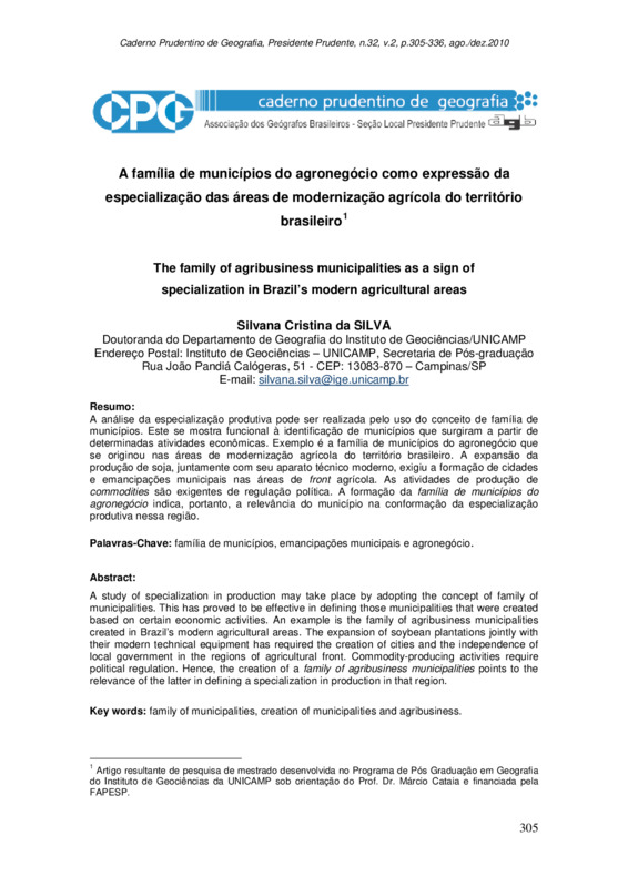 A análise da especialização produtiva pode ser realizada pelo uso do conceito de família de municípios. Este se mostra funcional à identificação de municípios que surgiram a partir de determinadas atividades econômicas. Exemplo é a família de municípios do agronegócio que se originou nas áreas de modernização agrícola do território brasileiro. A expansão da produção de soja, juntamente com seu aparato técnico moderno, exigiu a formação de cidades e emancipações municipais nas áreas de front agrícola. As atividades de produção de commodities são exigentes de regulação política. A formação da família de municípios do agronegócio indica, portanto, a relevância do município na conformação da especialização produtiva nessa região.