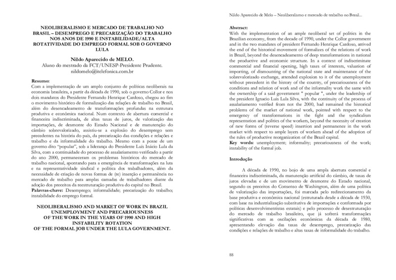 NEOLIBERALISMO E MERCADO DE TRABALHO NO BRASIL – DESEMPREGO E PRECARIZAÇÃO DO TRABALHO NOS ANOS DE 1990 E INSTABILIDADE/ALTA ROTATIVIDADE DO EMPREGO FORMAL SOB O GOVERNO LULA