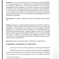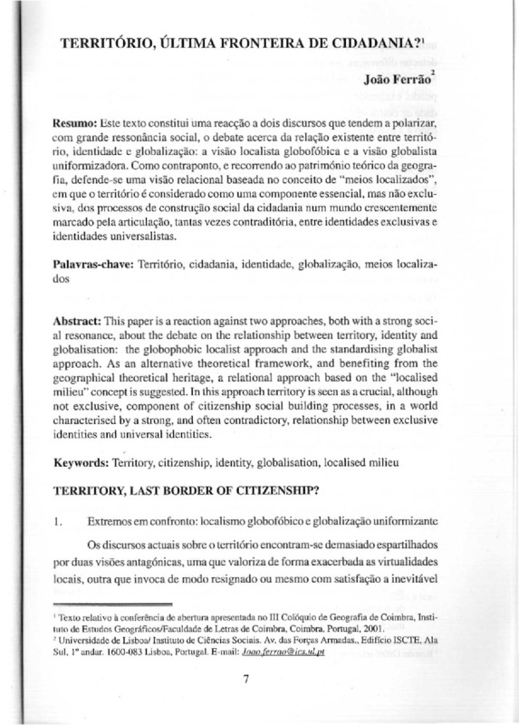 Este texto constitui uma reação a dois discursos que tendem a polarizar, com grande ressonância social, o debate acerca da relação existente entre território, identidade e globalização: a visão localista globofóbica e a visão globalista uniformizadora. Como contraponto, e recorrendo ao patrimonio teórico da geografia, defende-se uma visão relacional baseada no conceito de "meios localizados", em que o território é considerado como uma componente essencial, mas não exclusiva, dos processos de construção social da cidadania num mundo crescentemente marcado pela articulação, tantas vezes contraditória, entre identidades exclusivas e identidades universalistas.