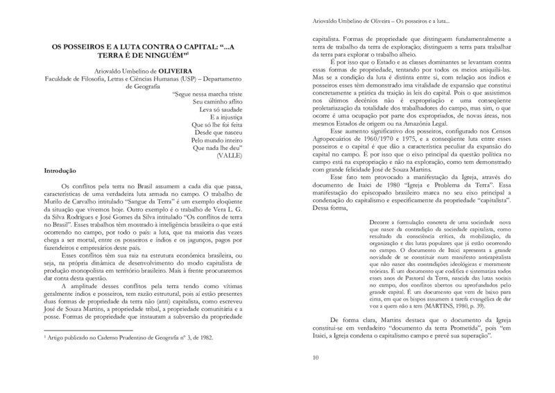 Artigo publicado no Caderno Prudentino de Geografia nº3, de 1982.Os conflitos pela terra no Brasil assumem a cada dia que passa, características de uma verdadeira luta armada no campo. O trabalho de Murilo de Carvalho intitulado “Sangue da Terra” é um exemplo eloqüente da situação que vivemos hoje. Outro exemplo é o trabalho de Vera L. G. da Silva Rodrigues e José Gomes da Silva intitulado “Os conflitos de terra no Brasil”. Esses trabalhos têm mostrado à inteligência brasileira o que está ocorrendo no campo, por todo o país: a luta, que na maioria das vezes chega a ser mortal, entre os posseiros e índios e os jagunços, pagos por fazendeiros e empresários deste país.