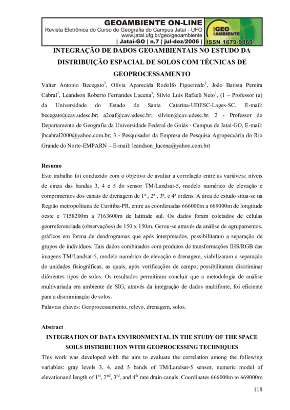 Este trabalho foi conduzido com o objetivo de avaliar a correlação entre as variáveis: níveis de cinza das bandas 3, 4 e 5 do sensor TM/Landsat-5, modelo numérico de elevação e comprimentos dos canais de drenagem de 1ª , 2ª , 3ª, e 4ª ordens. A área de estudo situa-se na Região metropolitana de Curitiba-PR, entre as coordenadas 666000m a 669000m de longitude oeste e 7158200m a 7163600m de latitude sul. Os dados foram coletados de células georreferenciada (observações) de 150 x 150m. Gerou-se através da análise de agrupamentos, gráficos em forma de dendrogramas que após interpretados, possibilitaram a separação de grupos de indivíduos. Tais dados combinados com produtos de transformações IHS/RGB das imagens TM/Landsat-5, modelo numérico de elevação e drenagem, viabilizaram a separação de unidades fisiográficas, as quais, após verificações de campo, possibilitaram discriminar diferentes tipos de solos. Os resultados permitiram concluir que a metodologia de análise multivariada em ambiente de SIG, através da integração de dados multifonte, foi eficiente para a discriminação de solos.