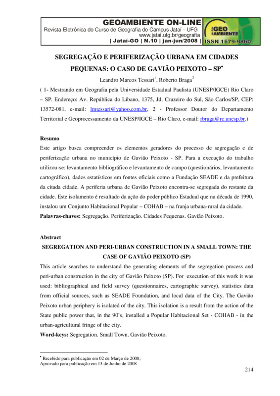 SEGREGAÇÃO E PERIFERIZAÇÃO URBANA EM CIDADES PEQUENAS: O CASO DE GAVIÃO PEIXOTO – SP