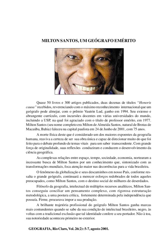 Quase 50 livros e 300 artigos publicados, duas dezenas de títulos “Honoris causa” recebidos, reverenciando com o máximo reconhecimento internacional que um geógrafo pode almejar, com o prêmio Vautrin Lud, ganho em 1994. Seu extenso e abrangente currículo, com incursões docentes em várias universidades do mundo, incluindo a USP, na qual foi agraciado com o título de professor emérito, em 1977. Milton Santos (seu nome completo era Milton de Almeida Santos, natural de Brotas de Macaúba, Bahia) faleceu na capital paulista em 24 de Junho de 2001, com 75 anos.