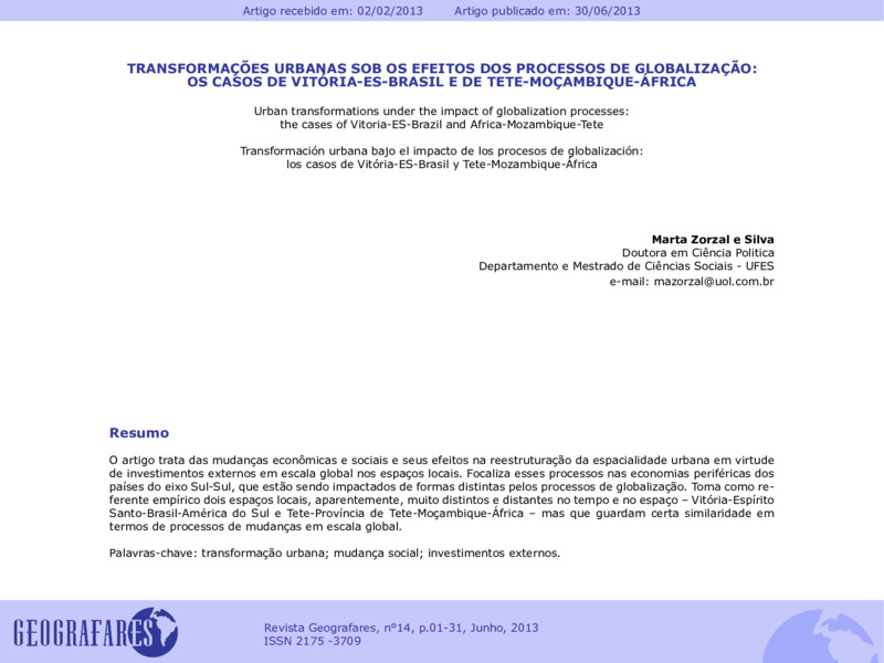 O artigo trata das mudanças econômicas e sociais e seus efeitos na reestruturação da espacialidade urbana em virtude de investimentos externos em escala global nos espaços locais. Focaliza esses processos nas economias periféricas dos países do eixo Sul-Sul, que estão sendo impactados de formas distintas pelos processos de globalização. Toma como referente empírico dois espaços locais, aparentemente, muito distintos e distantes no tempo e no espaço – Vitória-Espírito Santo-Brasil-América do Sul e Tete-Província de Tete-Moçambique-África – mas que guardam certa similaridade em termos de processos de mudanças em escala global.