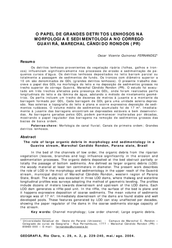 Os detritos lenhosos provenientes da vegetação ripária (folhas, galhos e troncos) influenciam significativamente nos processos de erosão e sedimentação de pequenos cursos d’água. Os detritos lenhosos depositados no leito barram parcial ou totalmente a passagem de sedimentos de fundo. Os troncos com diâmetro superior a 10 cm são denominados de GDL (grandes detritos lenhosos). O presente trabalho descreve o papel dos GDL na morfologia do leito e na deposição de sedimentos grossos no trecho superior do córrego Guavirá, Marechal Cândido Rondon (PR). O estudo foi executado em três trechos afetados pela presença de GDL, onde foram realizados perfis longitudinais do leito e da lâmina de água, adotando o método de nivelamento geométrico. Os perfis incluem um trecho de dezenas de metros à jusante e a montante da barragem formado por GDL. Cada barragem de GDL gera uma unidade soleira-depressão. Nas soleiras a topografia do leito é plana e ocorre expressiva deposição de sedimentos rudáceos. O volume médio de sedimentos acumulado foi de 17 m3. Imediatamente à jusante das barragens encontram-se depressões estáveis e bem desenvolvidas. As barragens geradas pelos GDL podem permanecer inalteradas por décadas, mostrando o papel regulador das barragens na remoção de sedimentos grossos das bacias de baixa ordem.