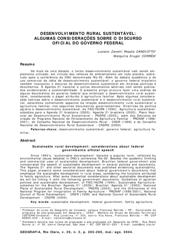 Palavras-chave: desenvolvimento sustentável; governo federal; agricultura familiar.