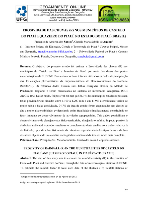 EROSIVIDADE DAS CHUVAS (R) NOS MUNICÍPIOS DE CASTELO DO PIAUÍ E JUAZEIRO DO PIAUÍ, NO ESTADO DO PIAUÍ (BRASIL)
