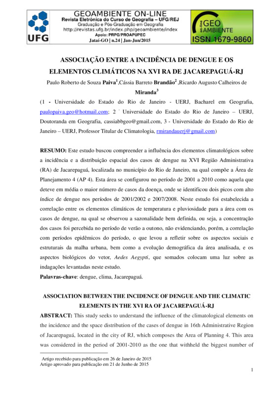 ASSOCIAÇÃO ENTRE A INCIDÊNCIA DE DENGUE E OS ELEMENTOS CLIMÁTICOS NA XVI RA DE JACAREPAGUÁ-RJ