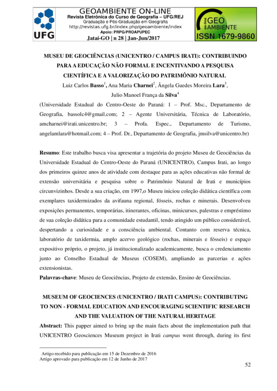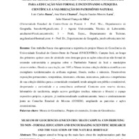 Este trabalho busca visa apresentar a trajetória do projeto Museu de Geociências da Universidade Estadual do Centro-Oeste do Paraná (UNICENTRO), Campus Irati, ao longo dos primeiros quinze anos de atividade com destaque para as ações educativas não formal de extensão universitária e pesquisa sobre o Patrimônio Natural de Irati e municípios circunvizinhos. Desde a sua criação, em 1997,o Museu iniciou coleção didática científica com exemplares taxidermizados da avifauna regional, fósseis, rochas e minerais. Desenvolveu exposições permanentes, temporárias, itinerantes, oficinas, minicursos, palestras e empréstimo de sua coleção didática para a comunidade estudantil, tendo atingido um público considerável, despertando a curiosidade e a consciência ambiental. Contanto com reserva técnica, laboratório de taxidermia, amplo acervo geológico (rochas, minerais e fósseis) e espaço expositivo próprio, o projeto, já institucionalizado academicamente, busca o credenciamento junto ao Conselho Estadual de Museus (COSEM), ampliando as parcerias e ações extensionistas.