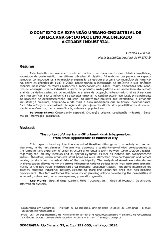 Este trabalho se insere em meio ao contexto de crescimento das cidades brasileiras, sobretudo de porte médio, nas últimas décadas. O objetivo foi elaborar um panorama espaço-temporal correspondente à formação e expansão da estrutura urbana do município de Americana, entre as décadas de 1940 e 2000, considerando a localização da indústria e sua dinâmica espacial, bem como os fatores históricos e socioeconômicos. Assim, foram elaborados sete cenários de ocupação urbano-industrial a partir de produtos cartográficos e de sensoriamento remoto e ainda de dados cadastrais do município. A análise da ocupação urbano-industrial de Americana permitiu verificar a forte influência da política nacional no cenário econômico local, principalmente do processo de desconcentração industrial da metrópole paulista que intensificou a atividade industrial já presente, ampliando ainda mais a área urbanizada que se tornou predominante. Este fato reforça a necessidade de ações de planejamento diante das possibilidades de crescimento econômico e, por conseqüência, urbano e populacional.