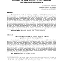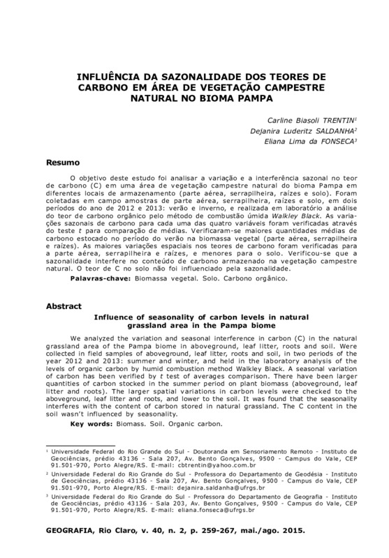 O objetivo deste estudo foi analisar a variação e a interferência sazonal no teor de carbono (C) em uma área de vegetação campestre natural do bioma Pampa em diferentes locais de armazenamento (parte aérea, serrapilheira, raízes e solo). Foram coletadas em campo amostras de parte aérea, serrapilheira, raízes e solo, em dois períodos do ano de 2012 e 2013: verão e inverno, e realizada em laboratório a análise do teor de carbono orgânico pelo método de combustão úmida Walkley  Black. As variações sazonais de carbono para cada uma das quatro variáveis foram verificadas através do teste t para comparação de médias. Verificaram-se maiores quantidades médias de carbono estocado no período do verão na biomassa vegetal (parte aérea, serapilheira e raízes). As maiores variações espaciais nos teores de carbono foram verificadas para a parte aérea, serrapilheira e raízes, e menores para o solo. Verificou-se que a sazonalidade interfere no conteúdo de carbono armazenado na vegetação campestre natural. O teor de C no solo não foi influenciado pela sazonalidade