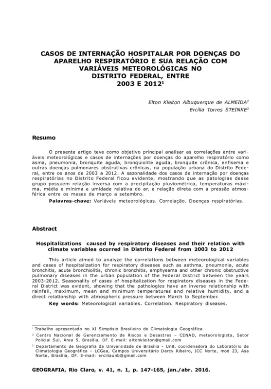 O presente artigo teve como objetivo principal analisar as correlações entre variáveis meteorológicas e casos de internações por doenças do aparelho respiratório como asma, pneumonia, bronquite aguda, bronquiolite aguda, bronquite crônica, enfisema e outras doenças pulmonares obstrutivas crônicas, na população urbana do Distrito Federal, entre os anos de 2003 a 2012. A sazonalidade dos casos de internação por doenças respiratórias no Distrito Federal ficou evidente, mostrando que as patologias desse grupo possuem relação inversa com a precipitação pluviométrica, temperaturas máxima, média e mínima e umidade relativa do ar, e relação direta com a pressão atmosférica entre os meses de março a setembro