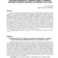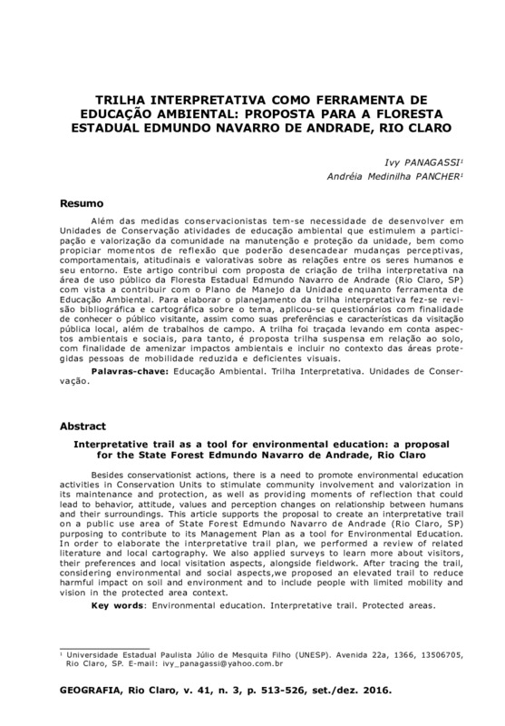 Além das medidas conservacionistas tem-se necessidade de desenvolver em Unidades de Conservação atividades de educação ambiental que estimulem a participação e valorização da comunidade na manutenção e proteção da unidade, bem como propiciar momentos de reflexão que poderão desencadear mudanças perceptivas, comportamentais, atitudinais e valorativas sobre as relações entre os seres humanos e seu entorno. Este artigo contribui com proposta de criação de trilha interpretativa na área de uso público da Floresta Estadual Edmundo Navarro de Andrade (Rio Claro, SP) com vista a contribuir com o Plano de Manejo da Unidade enquanto ferramenta de Educação Ambiental. Para elaborar o planejamento da trilha interpretativa fez-se revisão bibliográfica e cartográfica sobre o tema, aplicou-se questionários com finalidade de conhecer o público visitante, assim como suas preferências e características da visitação pública local, além de trabalhos de campo. A trilha foi traçada levando em conta aspectos ambientais e sociais, para tanto, é proposta trilha suspensa em relação ao solo, com finalidade de amenizar impactos ambientais e incluir no contexto das áreas protegidas pessoas de mobilidade reduzida e deficientes visuais