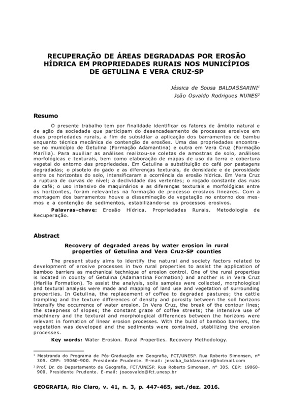 O presente trabalho tem por finalidade identificar os fatores de âmbito natural e de ação da sociedade que participam do desencadeamento de processos erosivos em duas propriedades rurais, a fim de subsidiar a aplicação dos barramentos de bambu enquanto técnica mecânica de contenção de erosões. Uma das propriedades encontra-se no município de Getulina (Formação Adamantina) e outra em Vera Cruz (Formação Marília). Para auxiliar as análises realizou-se coletas de amostras de solo, análises morfológicas e texturais, bem como elaboração de mapas de uso da terra e cobertura vegetal do entorno das propriedades. Em Getulina a substituição do café por pastagens degradadas; o pisoteio do gado e as diferenças texturais, de densidade e de porosidade entre os horizontes do solo, intensificaram a ocorrência da erosão hídrica. Em Vera Cruz a ruptura de curvas de nível; a declividade das vertentes; o roçado constante das ruas de café; o uso intensivo de maquinários e as diferenças texturais e morfológicas entre os horizontes, foram relevantes na formação de processo erosivos lineares. Com a montagem dos barramentos houve a disseminação de vegetação no entorno dos mesmos e a contenção de sedimentos, estabilizando-se os processos erosivos