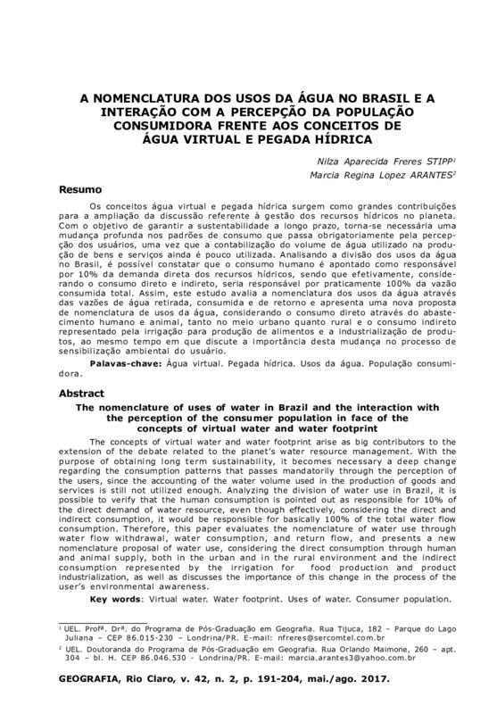 A NOMENCLATURA DOS USOS DA ÁGUA NO BRASIL E A INTERAÇÃO COM A PERCEPÇÃO DA POPULAÇÃO CONSUMIDORA FRENTE AOS CONCEITOS DE ÁGUA VIRTUAL E PEGADA HÍDRICA