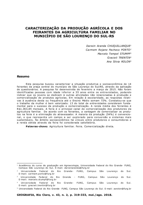 Esta pesquisa buscou caracterizar a situação produtiva e socioeconômica de 14 feirantes da praça central do município de São Lourenço do Sul/RS, através da aplicação de questionários. A pesquisa foi desenvolvida de fevereiro a março de 2015. Não foram identificadas pessoas com idade inferior a 35 anos entre os entrevistados, podendo indicar que os jovens se dedicam à outras atividades não relacionadas à produção e comercialização de produtos agrícolas. Em relação à escolaridade, as respostas relativas à ausência desta ou frequência até o Ensino Médio somam 72%. Constatou-se que o trabalho da mulher é bem valorizado: 13 do total de entrevistados consideram fundamental para o sucesso da produção e comercialização. A renda média dos feirantes é R$1.363,85 mensais. A feira é o principal canal de comercialização dos produtores da agricultura familiar. De acordo com os feirantes, a vantagem de comercializar os produtos na feira é a eliminação do atravessador. A maioria da produção (54%) é convencional, o que representa um campo a ser explorado para conversão a sistemas mais sustentáveis. No âmbito socioeconômico há vínculo entre produtores e consumidores e a renda obtida através da feira foi considerada satisfatória.