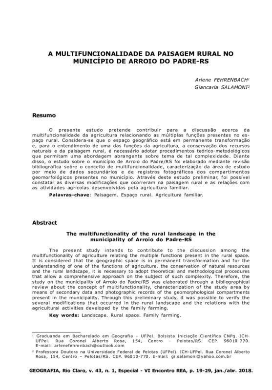 O presente estudo pretende contribuir para a discussão acerca da multifuncionalidade da agricultura relacionando as múltiplas funções presentes no espaço rural. Considera-se que o espaço geográfico está em permanente transformação e, para o entendimento de uma das funções da agricultura, a conservação dos recursos naturais e da paisagem rural, é necessário adotar procedimentos teórico-metodológicos que permitam uma abordagem abrangente sobre tema de tal complexidade. Diante disso, o estudo sobre o município de Arroio do Padre/RS foi elaborado mediante revisão bibliográfica sobre o conceito de multifuncionalidade, caracterização da área de estudo por meio de dados secundários e de registros fotográficos dos compartimentos geomorfológicos presentes no município. Através deste estudo preliminar, foi possível constatar as diversas modificações que ocorreram na paisagem rural e as relações com as atividades agrícolas desenvolvidas pela agricultura familiar.