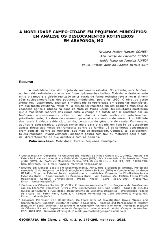 A mobilidade tem sido objeto de numerosos estudos. No entanto, este fenômeno tem sido estudado como se ele fosse tipicamente citadino. Todavia, o deslocamento entre o campo e a cidade realizado pelos rurais de forma rotineira revela novas dimensões sociodemográficas dos pequenos municípios, pós-anos 1990. O objetivo deste artigo foi, justamente, analisar a mobilidade campo-cidade em pequenos municípios, em sua faceta cotidiana, rotineira. O estudo foi realizado em um pequeno município de economia agrícola situado na Zona da Mata de Minas Gerais. Os resultados mostraram que a mobilidade rotineira dos rurais entre o campo e a cidade não se constituía em um fenômeno exclusivamente citadino. As idas à cidade estiveram relacionadas, prioritariamente, à esfera do consumo pessoal e aos modos de morar. A mobilidade dos rurais à cidade evidenciou, ainda, contornos de gênero e de renda. Os homens, adultos e aposentados, deslocavam-se mais para a cidade em função de possuírem acesso direto aos meios de transporte dentro da família. Já as senhoras aposentadas eram aquelas, dentre as mulheres, que mais se deslocavam. Contudo, tal deslocamento era realizado, invariavelmente, mediante gastos com táxi ou motorista para a cidade, diferentemente do que acontecia com os homens.