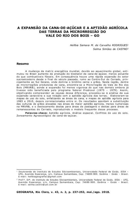 A EXPANSÃO DA CANA-DE-AÇÚCAR E A APTIDÃO AGRÍCOLA DAS TERRAS DA MICRORREGIÃO DO VALE DO RIO DOS BOIS - GO