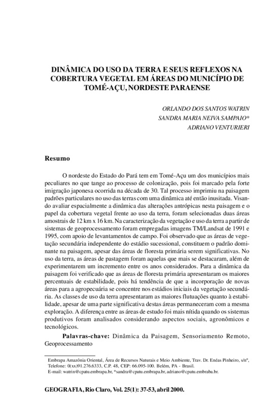 O nordeste do Estado do Pará tem em Tomé-Açu um dos municípios mais peculiares no que tange ao processo de colonização, pois foi marcado pela forte imigração japonesa ocorrida na década de 30. Tal processo imprimiu na paisagem padrões particulares no uso das terras com uma dinâmica até então inusitada. Visando avaliar espacialmente a dinâmica das alterações antrópicas nesta paisagem e o papel da cobertura vegetal frente ao uso da terra, foram selecionadas duas áreas amostrais de 12 km x 16 km. Na caracterização da vegetação e uso da terra a partir de sistemas de geoprocessamento foram empregadas imagens TM/Landsat de 1991 e 1995, com apoio de levantamentos de campo. Foi observado que as áreas de vegetação secundária independente do estádio sucessional, constituem o padrão dominante na paisagem, apesar das áreas de floresta primária serem significativas. No uso da terra, as áreas de pastagem foram aquelas que mais se destacaram, além de experimentarem um incremento entre os anos considerados. Para a dinâmica da paisagem foi verificado que as áreas de floresta primária apresentaram os maiores percentuais de estabilidade, pois há tendência de que a incorporação de novas áreas para a agropecuária se concentre nos estádios iniciais da vegetação secundária. As classes de uso da terra apresentaram as maiores flutuações quanto à estabilidade, apesar de uma parte significativa destas áreas permaneceram com a mesma exploração. A diferença entre as áreas de estudo foi mais nítida quando os sistemas produtivos foram analisados considerando aspectos sociais, agronômicos e tecnológicos.