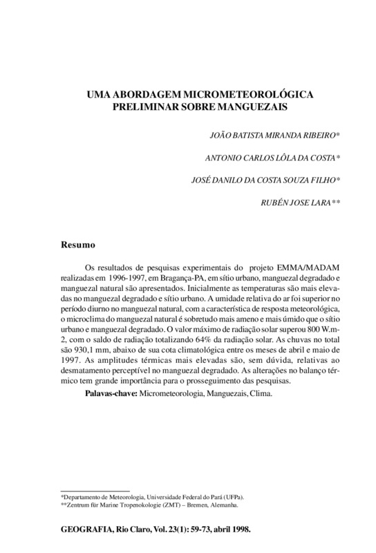 Os resultados de pesquisas experimentais do projeto EMMA/MADAM realizadas em 1996-1997, em Bragança-PA, em sítio urbano, manguezal degradado e manguezal natural são apresentados. Inicialmente as temperaturas são mais elevadas no manguezal degradado e sítio urbano. A umidade relativa do ar foi superior no período diurno no manguezal natural, com a característica de resposta meteorológica, o microclima do manguezal natural é sobretudo mais ameno e mais úmido que o sítio urbano e manguezal degradado. O valor máximo de radiação solar superou 800 W.m-2, com o saldo de radiação totalizando 64% da radiação solar. As chuvas no total são 930,1 mm, abaixo de sua cota climatológica entre os meses de abril e maio de 1997. As amplitudes térmicas mais elevadas são, sem dúvida, relativas ao desmatamento perceptível no manguezal degradado. As alterações no balanço térmico tem grande importância para o prosseguimento das pesquisas. Palavas-chave: Micrometeorologia, Manguezais, Clima.