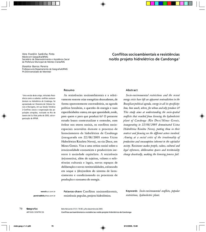 As resistências socioambientais e a relativamente recente crise energética desnudaram, de forma aparentemente contraditória, na agenda política brasileira, a questão da energia e suas especificidades: como, em que quantidade, onde, para quem e para que produzi-la? O presente estudo busca contextualizar e entender, com ênfase nos atores sociais, os conflitos socio-espaciais ocorridos durante o processo de licenciamento da hidrelétrica de Candonga (inaugurada em 22/08/2005 como Usina Hidrelétrica Risoleta Neves), no rio Doce, em Minas Gerais. Visa a uma crítica social sobre a irracionalidade consumista e produtivista inerente à sociedade capitalista. A resistência (re)constitui, além de sujeitos, valores e referências culturais e legais, novos espaços de deliberação e novas territorialidades, colocando em xeque a (des)ordem do sistema de licenciamento e condicionando os processos de produção e consumo de energia.