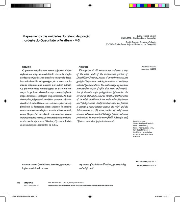 O presente trabalho teve como objetivo a elaboração de um mapa de unidades do relevo da porção nordeste do Quadrilátero Ferrífero, em virtude de sua importância ambiental e geológica, de modo a complementar mapeamentos iniciados por outros autores. Os procedimentos metodológicos se basearam em etapas de gabinete, visitas de campo e compilação de mapas temáticos: geológico e hipsométrico. Ao final do trabalho, foi possível identificar quatorze unidades do relevo distribuídas em duas unidades principais: (i) planaltos e (ii) depressões. Nestas unidades foi possível constatar uma forte relação com o fator litoestrutural, como: (1) porções elevadas do relevo ocorrendo em litotipos mais resistentes; (2) áreas rebaixadas predominando nos litotipos mais friáveis e; (3) cursos fluviais controlados por lineamentos de falhas.